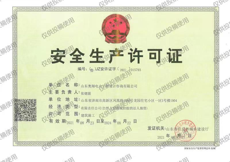8月26日,山東奧翔電力工程設計咨詢有限公司正式取得由山東省住房與城鄉建設廳頒發的安全生產許可證。